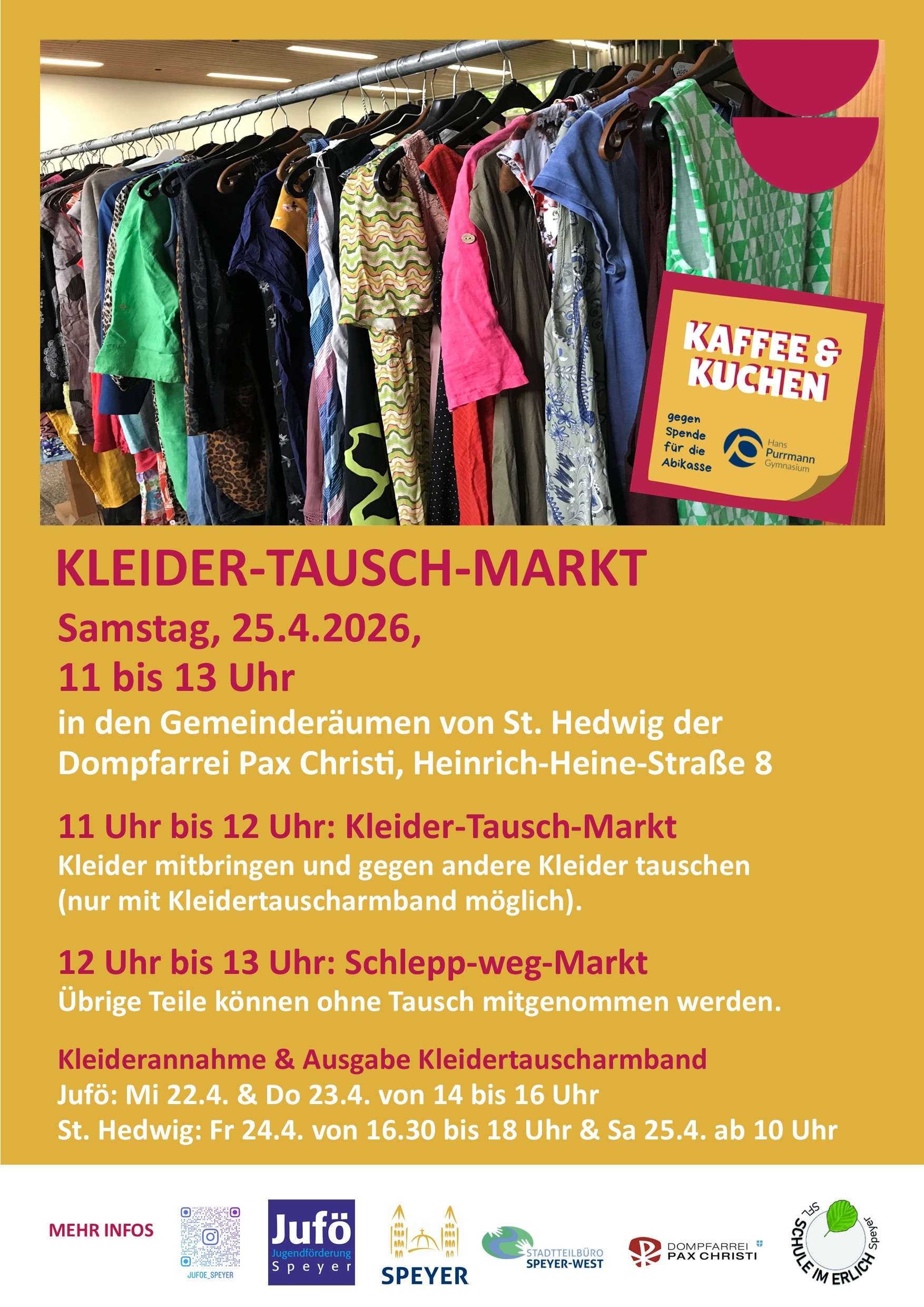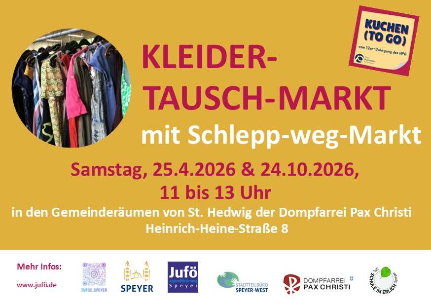 Der Kleidertauschmarkt wird am Samstag, den 25. April 2026 in den Gemeinderäumen von St. Hedwig der Dompfarrei Pax Christi, Heinrich-Heine-Straße 8, stattfinden.