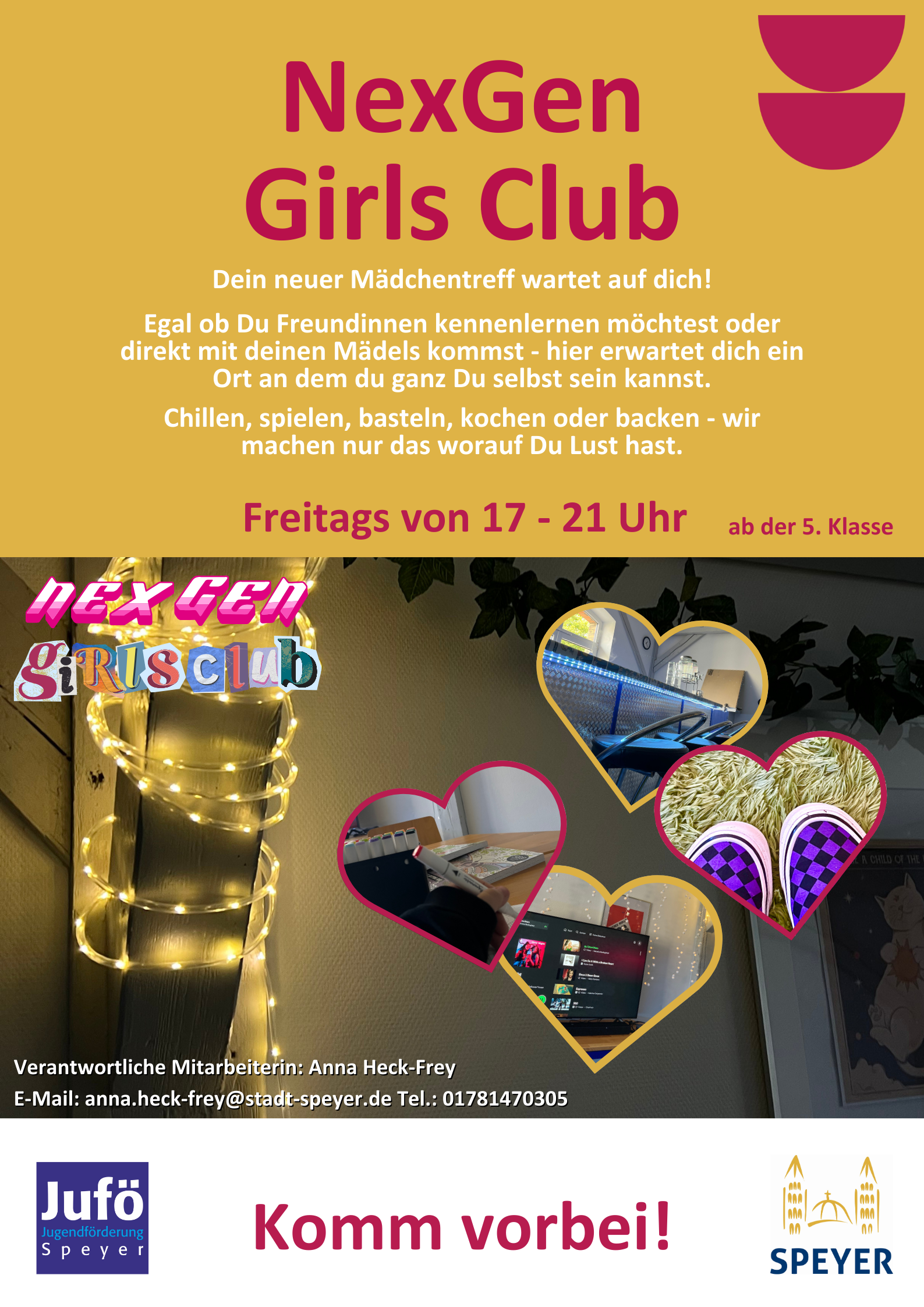 Du hast noch Fragen? Du bist dir unsicher, ob der NexGen Girls Club für dich das richtige Angebot ist? Du würdest einfach gerne wissen was wir so machen? Melde dich gerne bei Anna Heck-Frey: Tel. 06232 / 14-1914 oder 01781470305. Sie leitet den Girls Club und nimmt sich gerne für dich Zeit. Ruf einfach an oder schreib ihr eine Mail. Mo. bis Fr. zwischen 08:00 und 15:00 Uhr kannst du dich bei ihr melden.