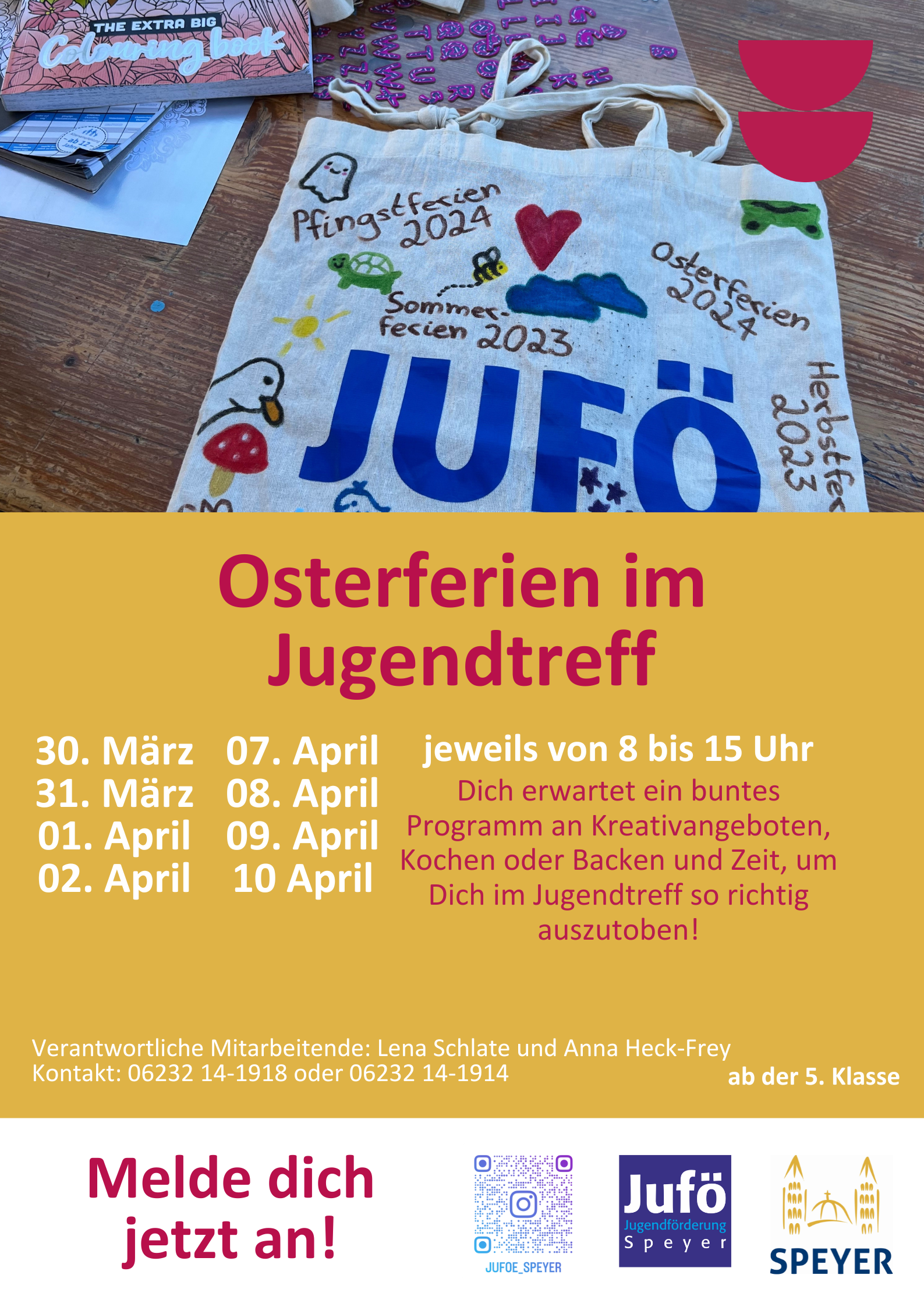 In den Osterferien 2026 wird's bunt und lecker! Von 8 bis 15 Uhr erwarten euch im Jugendtreff (in der Seekatzstraße 5) coole Kreativwerkstätten, Spiel- und Spaßangebote sowie leckere Koch- und Backangebote.