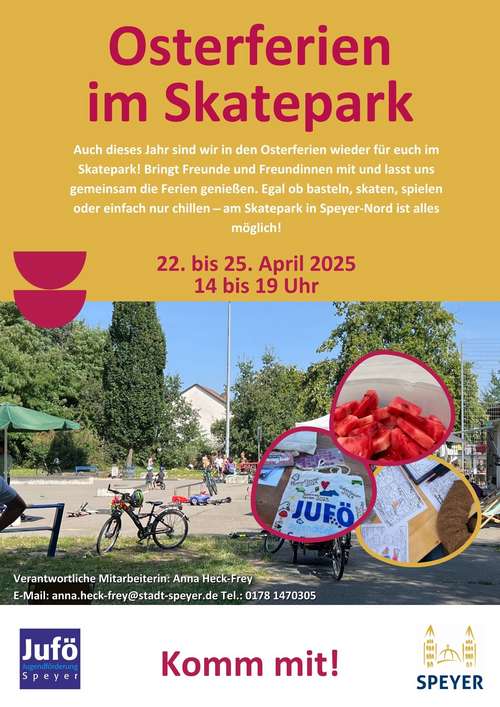 Auch dieses Jahr sind wir in den Osterferien wieder mit Chillmo und Jufömobil im Skatepark in Speyer - Nord für euch vor Ort.