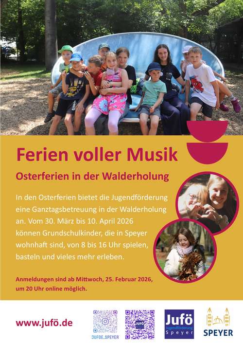 In den Osterferien 2026 (30.03. bis 10.04.) bieten wir werktags ein Ganztagsprogramm in der Walderholung für Speyerer Grundschulkinder an. Die Kinder haben neben den Spielgelegenheiten der Walderholung auch die Möglichkeit Ausflüge in die nähere Umgebung zu machen, zu basteln, zu toben, Musikinstrumente zu bauen und vieles mehr zu erleben.