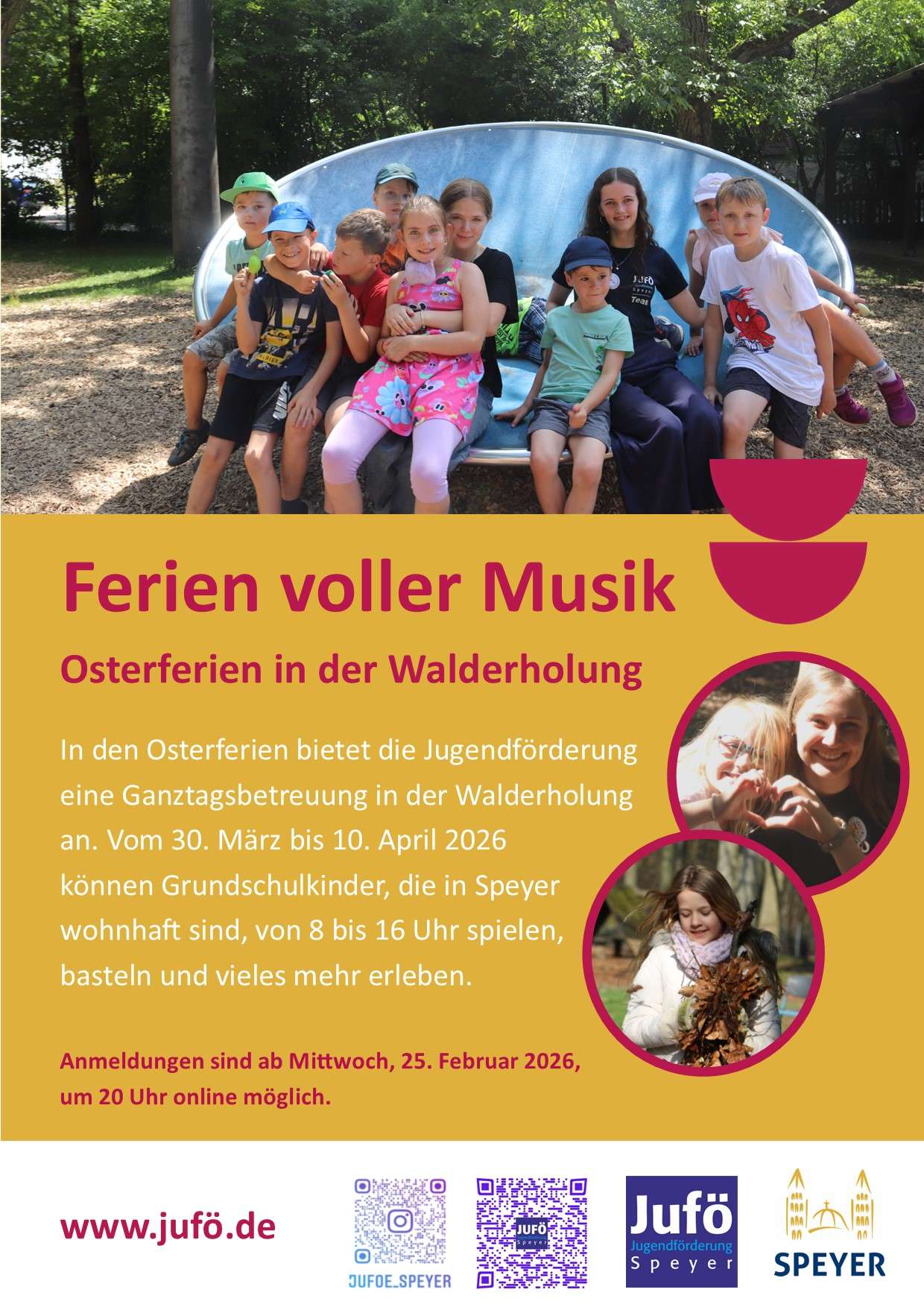 In den Osterferien 2026 (30.03. bis 10.04.) bieten wir werktags ein Ganztagsprogramm in der Walderholung für Speyerer Grundschulkinder an. Die Kinder haben neben den Spielgelegenheiten der Walderholung auch die Möglichkeit Ausflüge in die nähere Umgebung zu machen, zu basteln, zu toben, Musikinstrumente zu bauen und vieles mehr zu erleben.