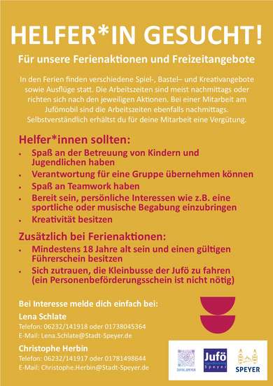 Die Jugendförderung ist immer auf der Suche nach Jugendlichen und jungen Erwachsenen, die Interesse an der Arbeit mit Kindern und Jugendlichen haben. Neben der Mitarbeit in den Sommerferienprogrammen, könnt ihr auch bei unseren Oster- und Herbstferienmaßnahmen mitwirken. Die Mitarbeit erfolgt in allen Ferienmaßnahmen wochenweise.