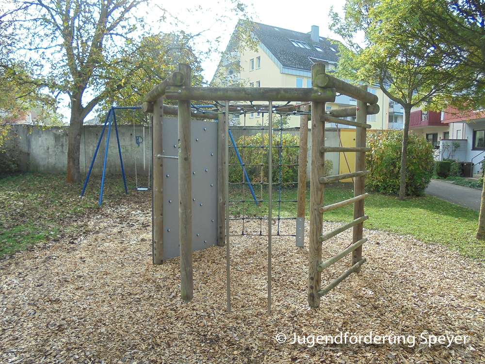 Dieser Spielplatz in Speyer-Ost hat einen Hügel und sogar eine Brücke. Etwas abgeschirmt vom Verkehr gibt es Spielmöglichkeiten für Kindergartenkinder und auch für Jugendliche.