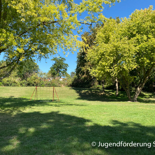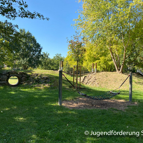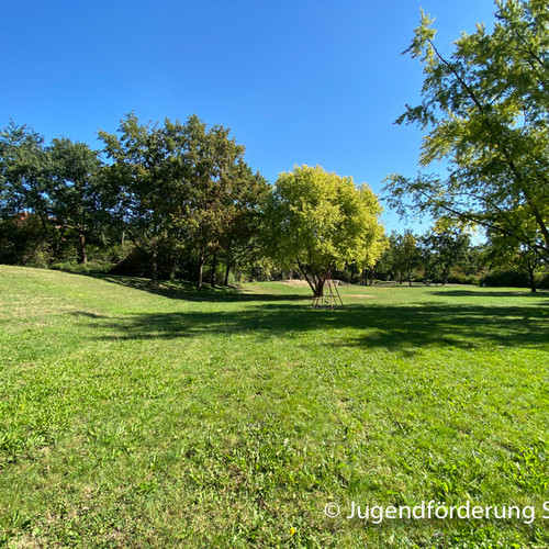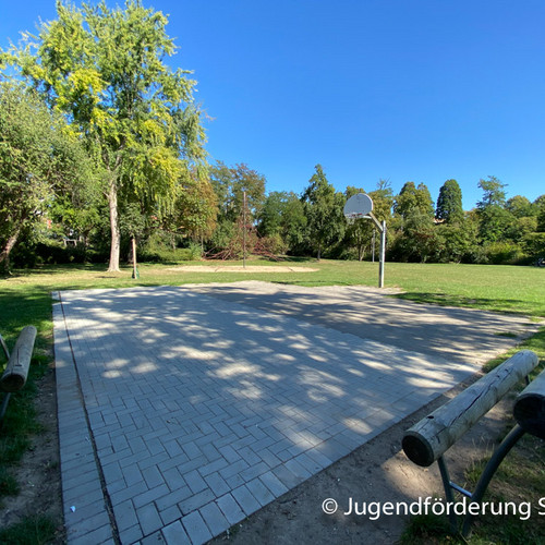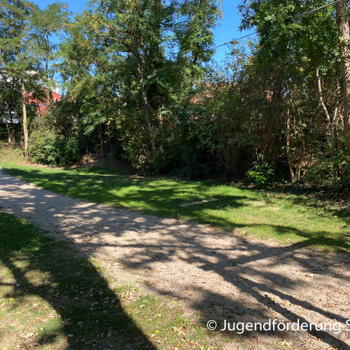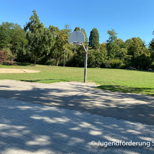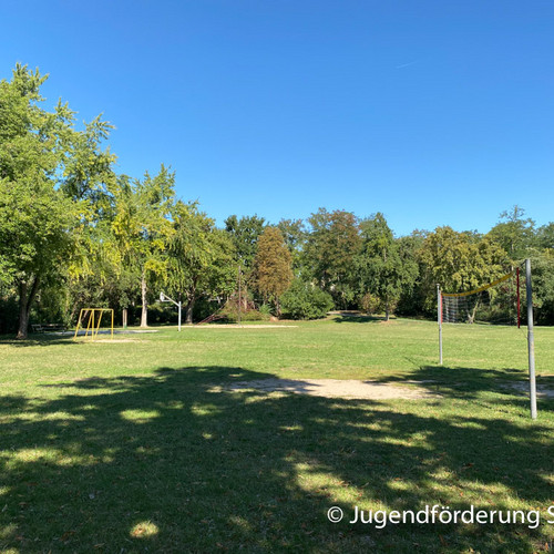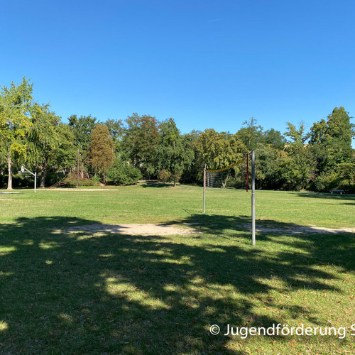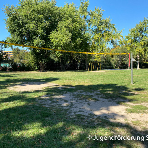 Für Jugendliche gibt es ein Volleyballfeld, einen Bolzplatz und einen Basketballkorb.